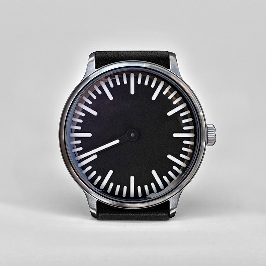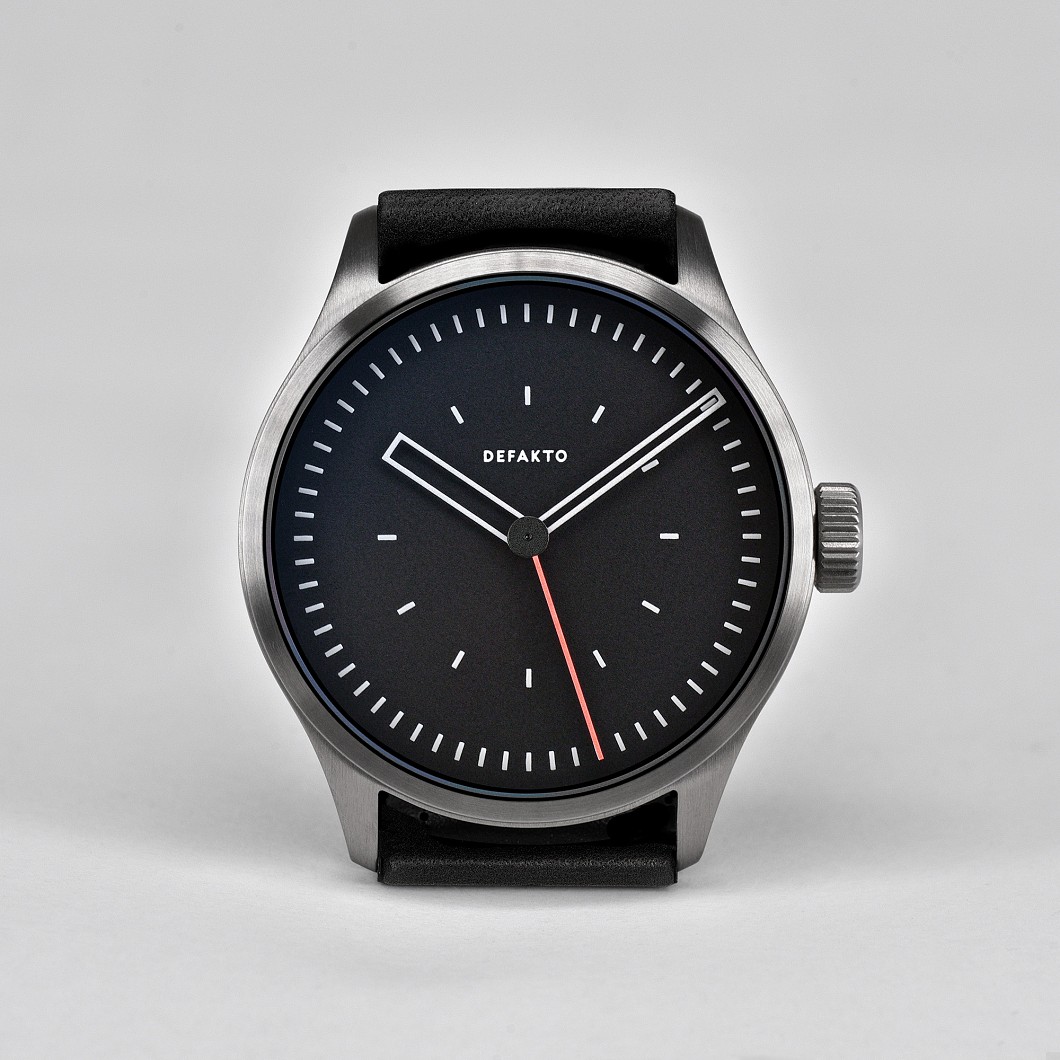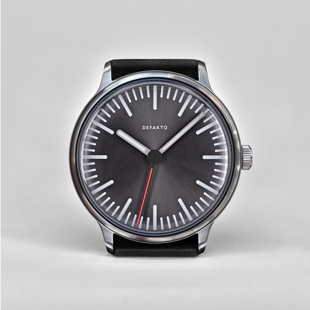 Die minimalistische, nachts stark leuchtende Einzeigeruhr Defakto Meta Inkognito (40mm x 44mm x 9,8mm, Gewicht 58g) basiert auf der Kernidee die intuitive Zeitwahrnehmung Ihres Trägers zufördern und so entschleunigend zu wirken. Da die Indizes nur die Stunden- und Viertelstundenperioden darstellen, wird auf der Defakto Meta die Zeit in ungefähren Intervallen und nicht in genauen Minuten oder Sekunden gelesen. Mit dem großen Einzelzeiger werden sowohl die Stunde als auch die ungefähre Minute gleichzeitig abgelesen.