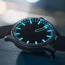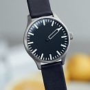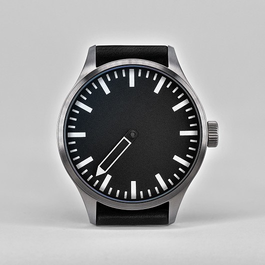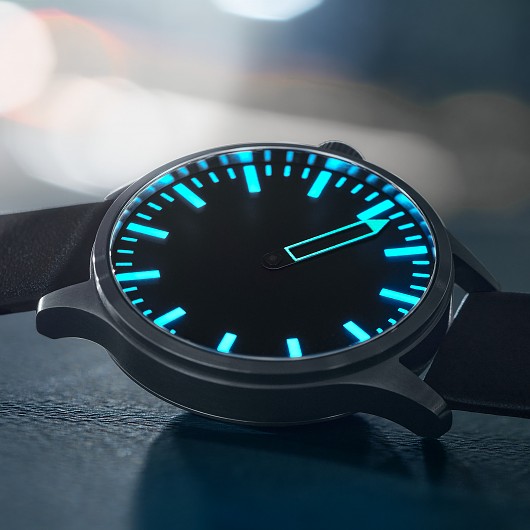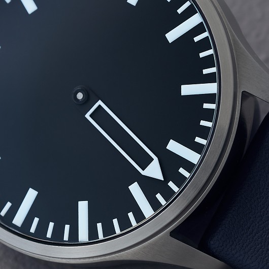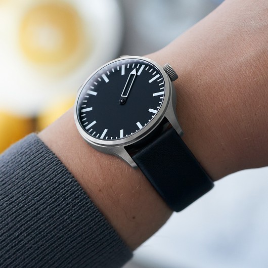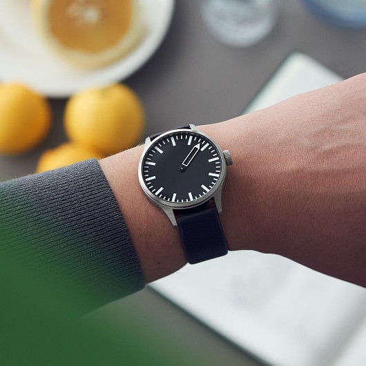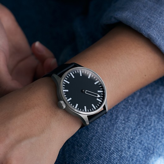 Das 42mm Edelstahlgehäuse mit kratzfestem Saphirglas fasst das matt schwarze Zifferblatt und fluoreszierenden Indexen und Zeiger (Superluminova BGW9 und C1). Die Einzeigeruhr (wasserdicht 10 ATM) sticht durch ihren großen skelettierten Zeiger und ihre stark reduzierte 15 Minuten Zeitskalierung ins Auge. Das Design der automatischen Einzeigeruhr ist die Folge des Wunsches eine Uhr zu schaffen, welche die Zeitwahrnehmung entschleunigt und so zu einer entspannteren Wahrnehmung des Alltags führt.