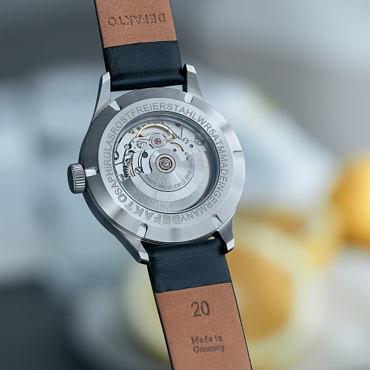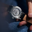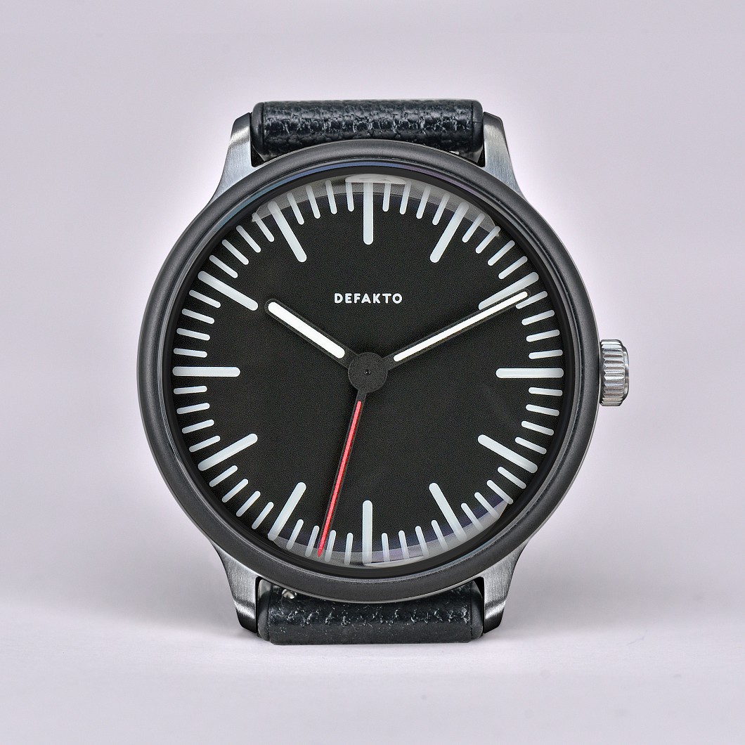 Die Defakto Eins Inkognito (42mm x 51mm x 9,8mm, 67g) ist ganz dem Purismus verschrieben. Neben ästhetischen Vorzügen bietet die logo-lose Einzeigeruhr eine weitere Besonderheit: Die Eignung sowohl für Links- als auch Rechtshänder ohne Umbau. Aufgrund der Gestaltung kann die Uhr um 180 Grad gedreht werden und am anderen Arm getragen werden.