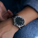 Aufgrund der weitläufigen, fast schon brutalistisch anmutenden Indexierung kann die Zeit auf etwa 5 Minuten genau abgelesen werden. Trägt man die Uhr eine Weile bemerkt man einen positiven, intuitiveren Umgang mit der Zeit. Das in Deutschland handgefertigte Rindlederarmband verfügt über ein Schnellwechselsystem für Werkzeug.