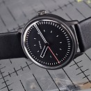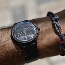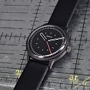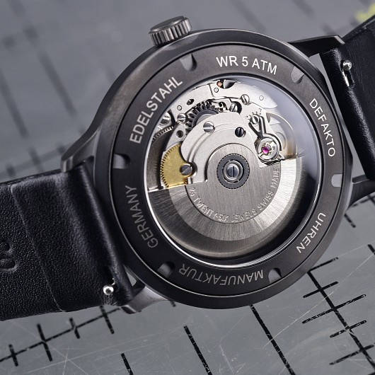 Die skelettierten Zeiger sind zu den getrennt dargestellten, durchscheinenden Minuten- und Stundenindexen des Zifferblattes in identischer Strichstärke angelegt und ermöglichen eine sehr gute, geführte Lesbarkeit. Das in-house hergestellte, dreiteilige 40 mm Edelstahl-Uhrgehäuse (5 Atm) mit gewölbtem Saphirglas gibt der Uhr ihre elegant zurückhaltende Kompaktheit. Hier in der sandgestrahlten und danach mit hochfestem DLC beschichteten Oberfläche. Das verbaute Schweizer Automatik-Uhrwerk Sellita Sw 200 zeigt verlässlich die Zeit an und bietet eine sehr gute Wartbarkeit. Die Uhr kann optional auch mit dem Handaufszugswerk Sellita 215 ausgestattet werden. Die fließende Sekunde bringt dabei kontinuierliche Bewegung ins kinetische Spiel und generiert ständig neue geometrische Konstellationen und symmetrische Überlagerungen direkt am Handgelenk des Trägers.
