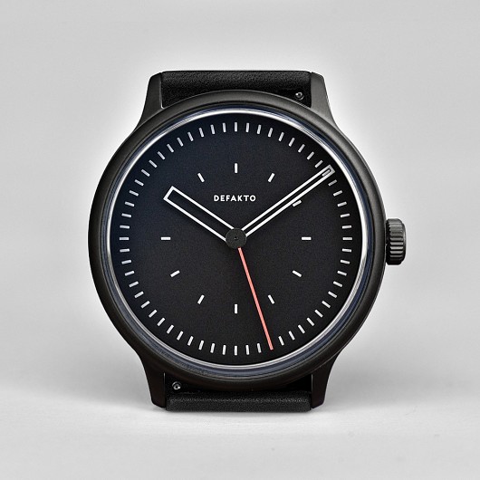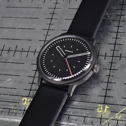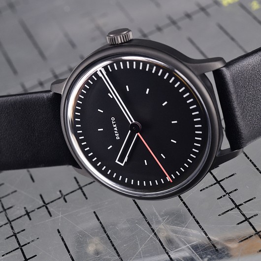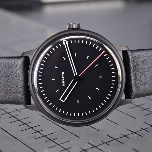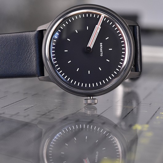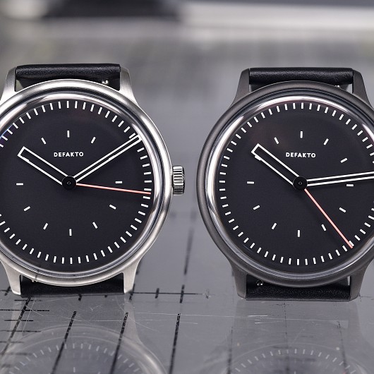Ein Cuvée der Kinetik und Transit. Das integrierte, minimalistische Design der Defakto Kinetik Atmo (40mm x 44mm x 9,8mm (6,8mm ohne Saphirglas), Gewicht 58 g) hat das Ziel die Interaktion der Zeiger und die dabei entstehenden geometrischen Konstellationen visuell hervorzuheben. Die kompakte, flache Uhr eignet sich perfekt auch für kleinere Armumfänge.