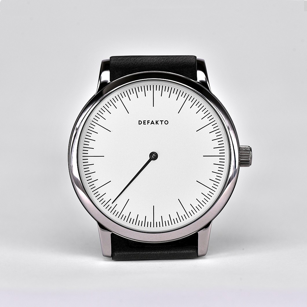 Die fein gezeichnete Indexierung und die gebogenen Zeiger mit ihren gleich großen, kreisförmigen Aufnahmescheiben gründen den modernen, puristischen Charakter der unisex Uhr. Das in-house hergestellte, gebürstete Edelstahl-Gehäuse ist inkl. dem gewölbten Saphirglas 9,8mm flach. Die fließende Sekunde fährt konstant durch den gebogenen Raum der Uhr. Die Defakto Vektor Orbit ist auf Anfrage als Rechts- oder Linkshänderuhr montierbar, sowie mit einem Handaufzugswerk austattbar.